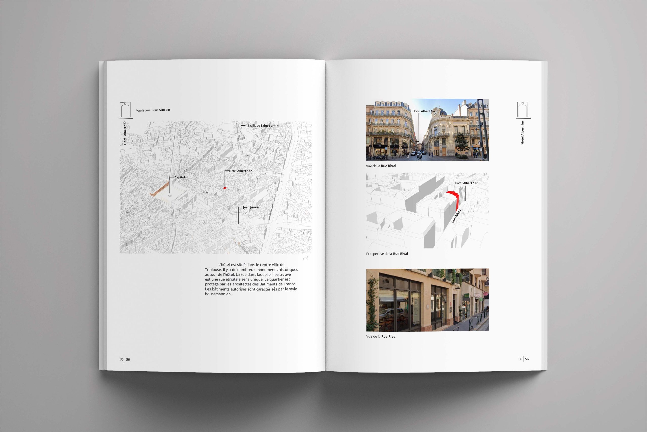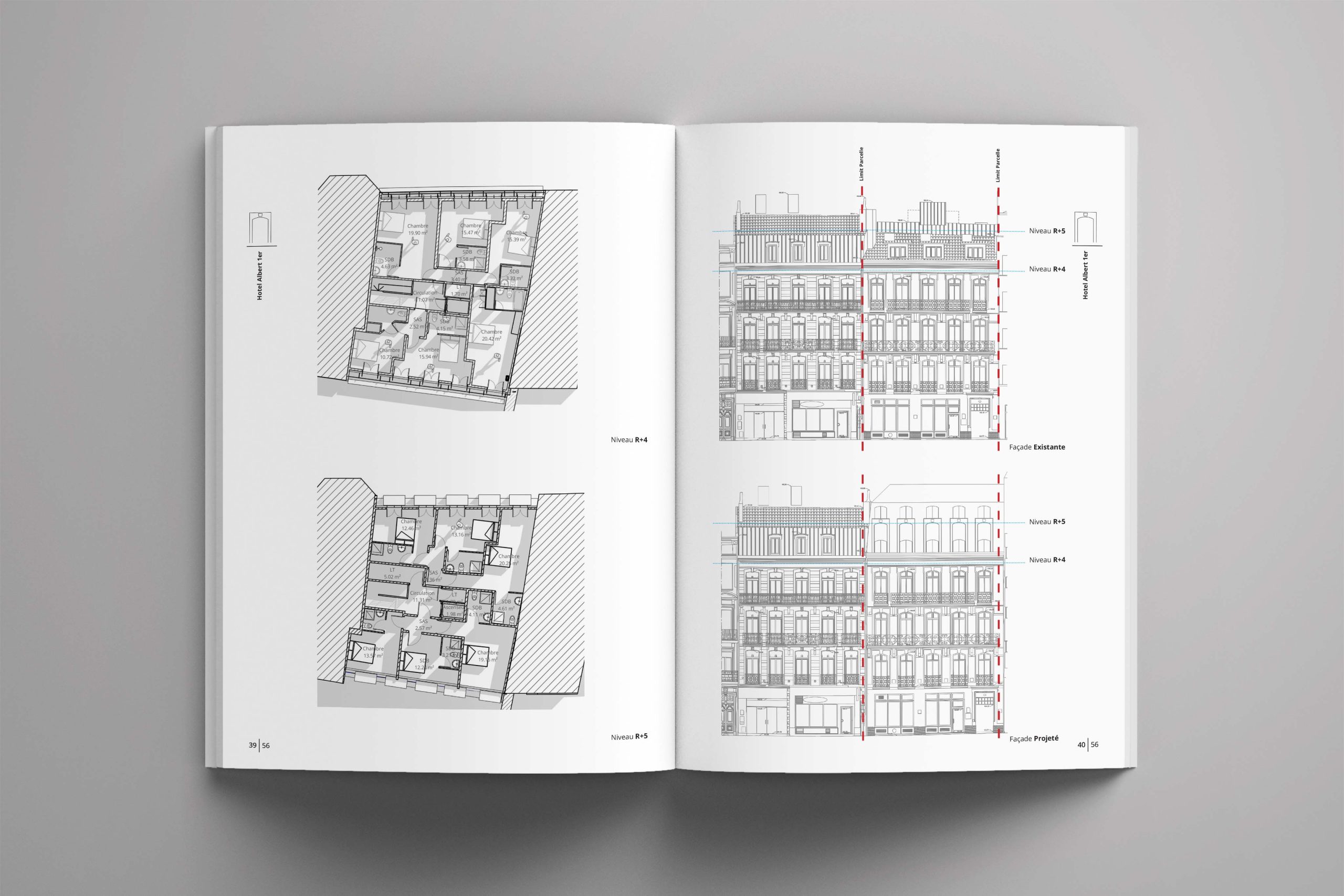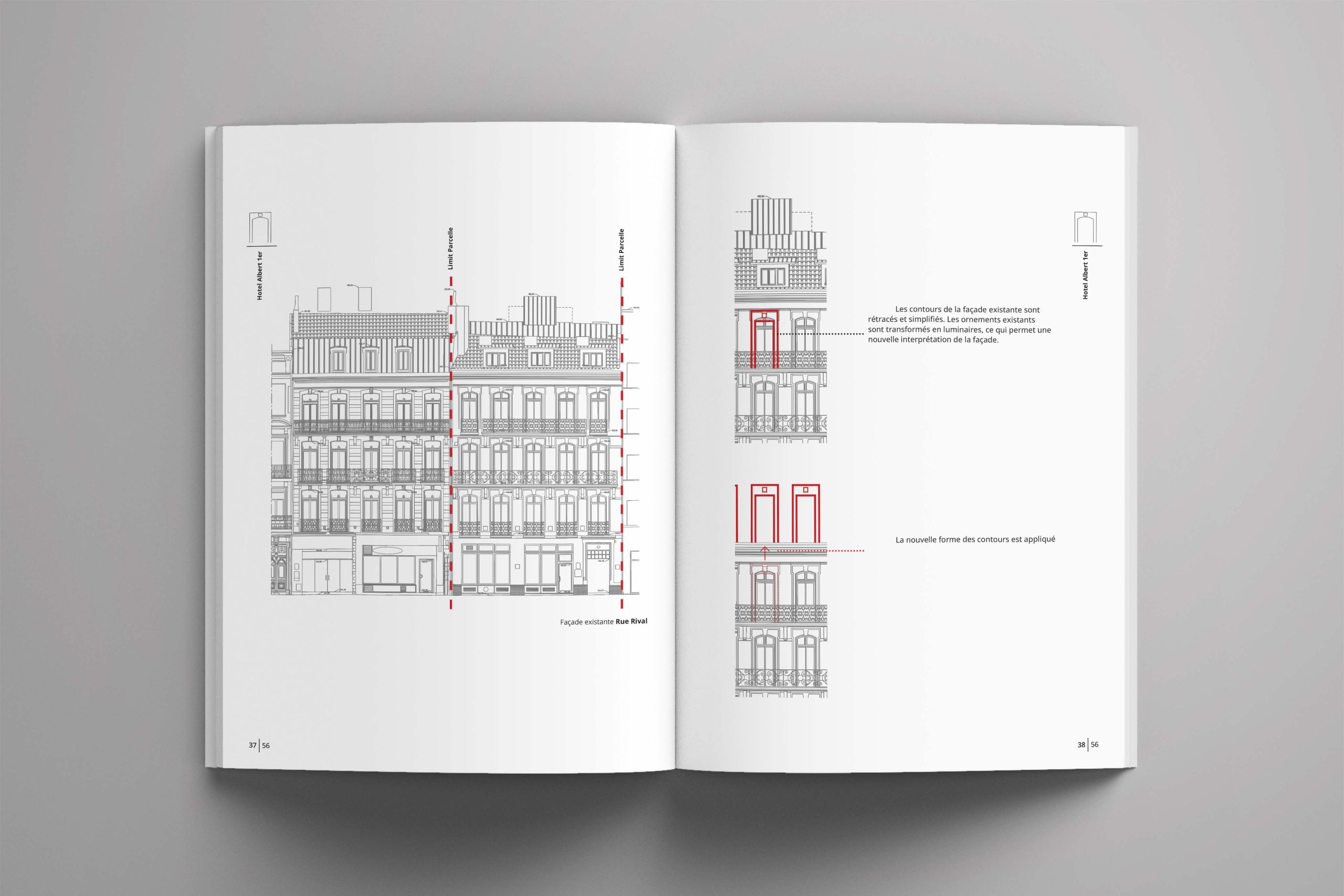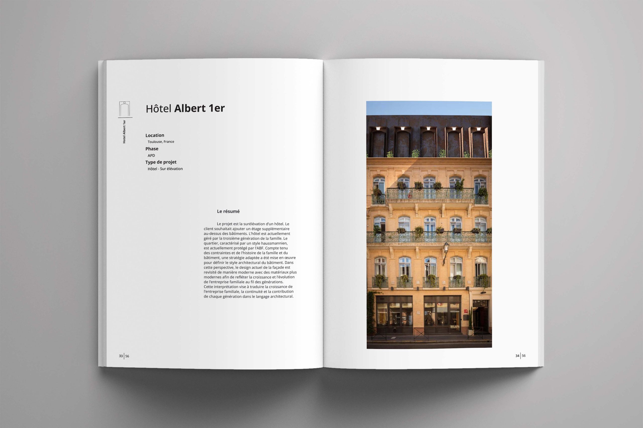 Le projet est la surélévation d’un hôtel. Le client souhaitait ajouter un étage supplémentaire au-dessus des bâtiments. L’hôtel est actuellement géré par la troisième génération de la famille. Le quartier, caractérisé par un style haussmannien, est actuellement protégé par l’ABF. Compte tenu des contraintes et de l’histoire de la famille et du bâtiment, une stratégie adaptée a été mise en oeuvre pour définir le style architectural du bâtiment. Dans cette perspective, le design actuel de la façade est revisité de manière moderne avec des matériaux plus modernes afin de refléter la croissance et l’évolution de l’entreprise familiale au fil des générations. Cette interprétation vise à traduire la croissance de l’entreprise familiale, la continuité et la contribution de chaque génération dans le langage architectural.